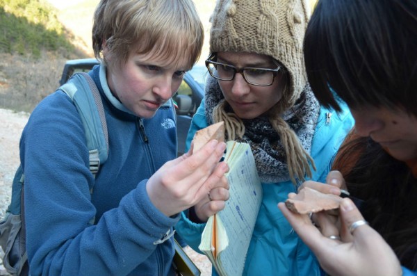At another K/T outcrop, this one in Furlo, junior Reid Dubois Jenkins and Mathieson search for the extinction layer with hand lenses