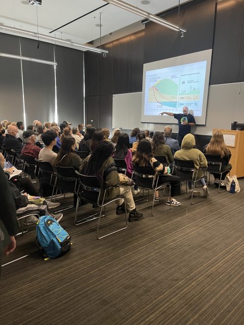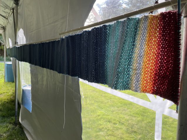 It was a full house for Martin Stute’s lecture about turning CO2 to stone. Photo: Caroline AdelmanGlaciologist Indrani Das and her team showed off real equipment that’s used to study the structure of glaciers all the way down to their underlying bedrock. Photo: Sarah FechtAn installation demonstrating earth-based construction techniques, from the Farm to Building Project Design at Columbia’s Graduate School of Architecture, Preservation, and Planning. Photo: Sarah FechtStencils help to teach kids about different types of leaves. Photo: Tara SpinelliVisitors brought soil and paint samples from their homes and neighborhoods for lead testing by Lex van Geen and his students. Photo: Tara SpinelliA poster shows how surface temperatures have been increasing since the 1850s. Photo: Suzana CamargoIn a new exhibit, the Tempestry Project shared how they translate climate data into impactful knitted visualizations. Photo: Elisabeth SydorA loooong tapestry shows global temperatures starting in the year 1 AD (left) all the way up to modern times. Photo: Sarah FechtEach line in this piece, created by the Tempestry Project, represents one year of temperature data starting in the year 1 AD. Notice how rapidly things heat up as we get closer to modern times. Beads near the bottom mark every 50 years. Video: Sarah FechtSelecting strings of different colors, visitors made their own temperature reconstructions (see below). Photo: Sarah FechtPhoto: Elisabeth SydorPhoto: Sarah FechtAn Open House favorite: a trash can volcano demonstrating the most violent type of volcanic eruption, also known as a Plinian eruption. Photo: Olga Ruskovets