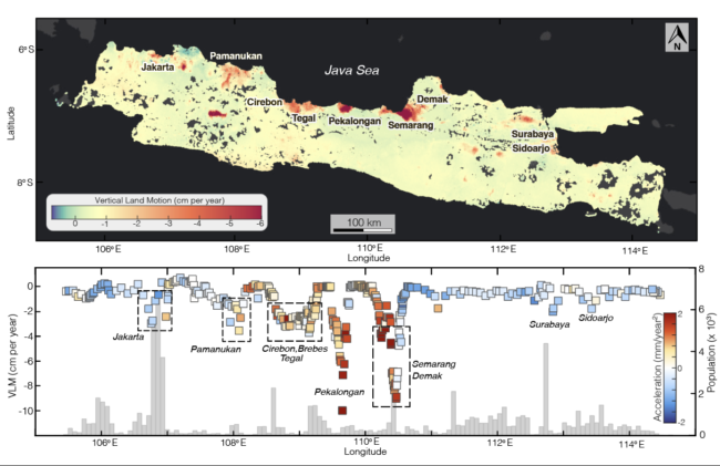 A study published today in Science Advances finds that land subsidence, or the sinking of the ground, is outpacing ocean-driven sea-level rise along nearly the entire northern coastline of Java Island, Indonesia. The island is home to more than 150 million people—approximately 2% of the global population. The new research offers the most spatially comprehensive assessment of this hazard to date and reveals a problem far larger than the well-publicized sinking of Jakarta.